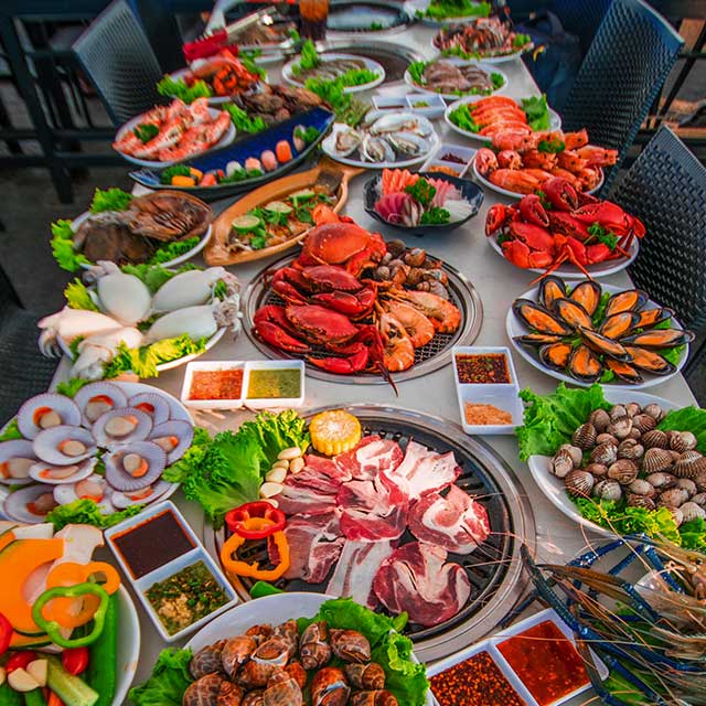 Huge buffet selection of food ranging from fresh seafood to cooked dishes, sushi, and desserts.