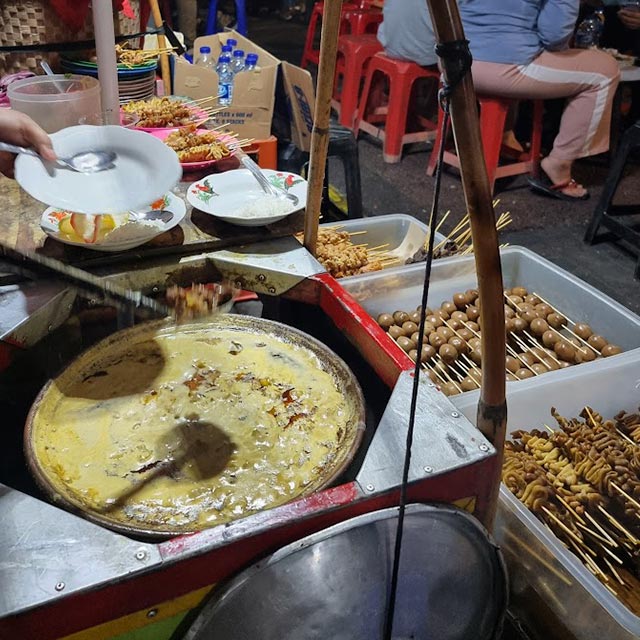 Martabak is a renowned street food that comes in two types: Martabak Manis (sweet pancake) and Martabak Telur (egg pancake).