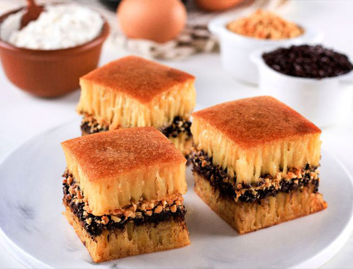 Martabak Manis is usually a thick and sweet pancake that is topped with various toppings ranging from chocolate, cheese, peanuts, to condensed milk. Martabak Telur, the savoury type, are crispy pancakes that consist of eggs, chicken or beef meat, and scallions.