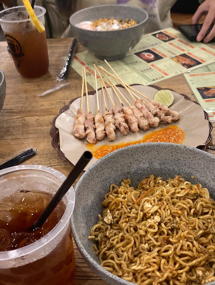 Indomie Goreng Plus Plus (choose your own toppings, we recommend the soft eggs), Sate Taichan, Roti Panggang (Grilled bread)