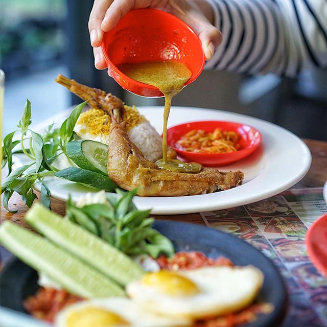 Fried Chicken. If you love a spicy kick, Warung Bu Kris is where you should head to. Their signature dish, Ayam Penyet,(literally translates to bashed-up chicken) is tenderized chicken marinated in a yellow spice paste and then deep-fried in hot palm oil.