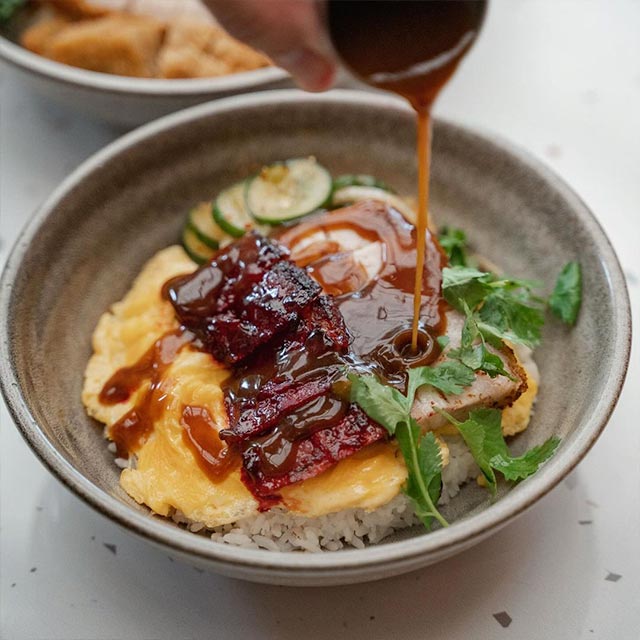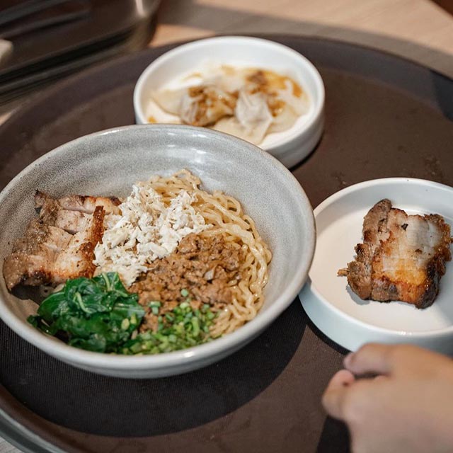 Bakmi [buck-mee] is Chinese-style wheat noodles in Indonesia, adapted to Indonesian tastes. The name Bakmi translates to "meat noodles". Most Bakmi in Indonesia is prepared with chicken or beef, but Louibelly serves a style that features crispy roast pork (similar to ΰΈ«ΰΈ‘ΰΈΉΰΈΰΈ£ΰΈΰΈ or ηθ).